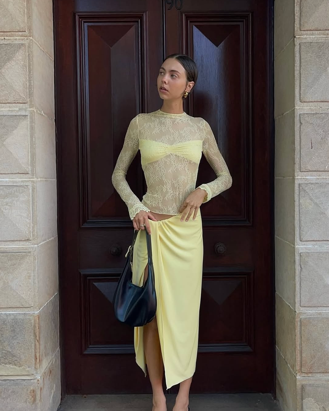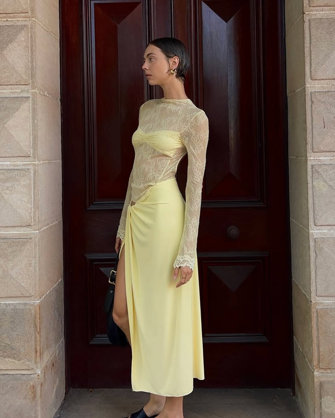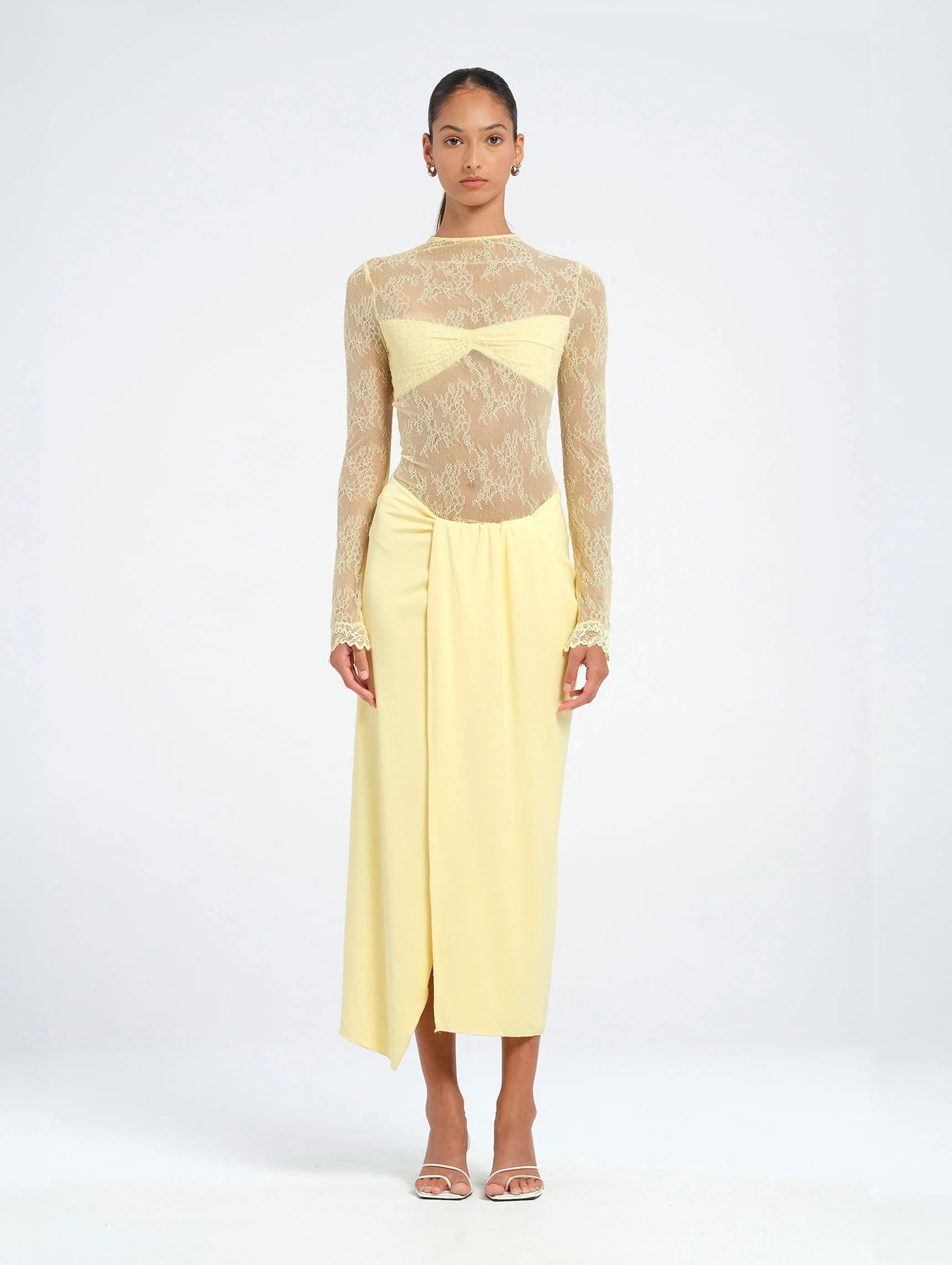Description: The Colton Midi Dress features a high-neck lace bodice with long sleeves, an open back with hook-and-eye closure, and a built-in modesty bralette for comfort and support. A soft jersey skirt flows from the waist with a sculptural knot detail and thigh-high split, making this a standout piece for any formal occasion.