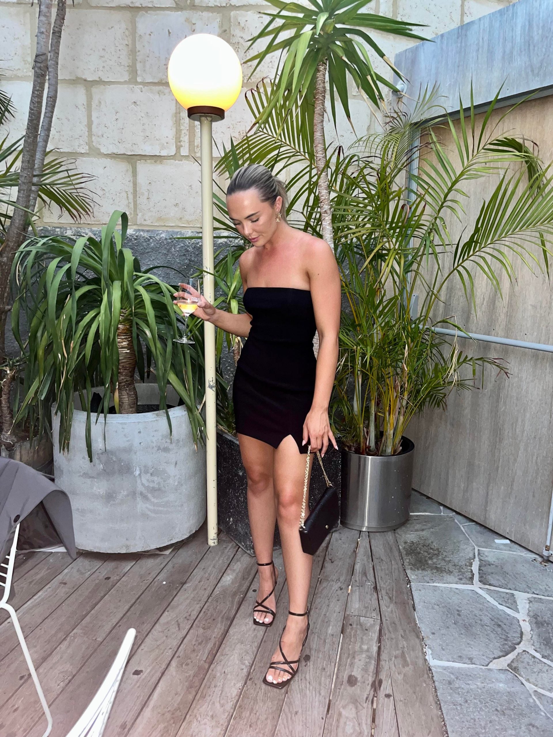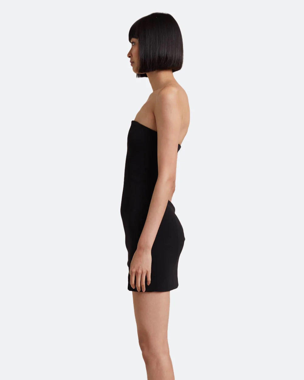 Description: Cut from a stretch bonded crepe, the Karina Strapless Mini Dress is a figure-hugging design that cinches in the waist. The mini dress features a flattering strapless neckline, complemented by side-tuck detailing.