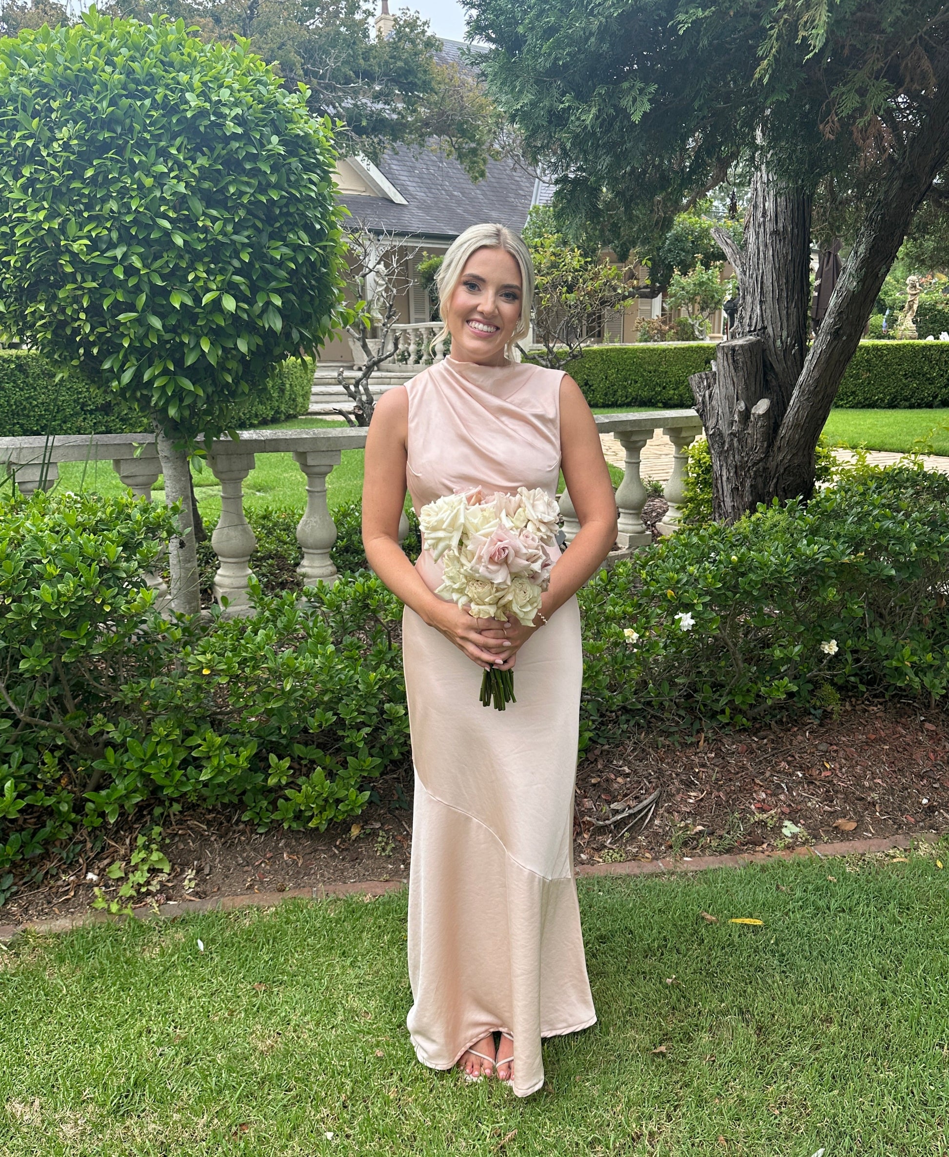 Description: The Lana Maxi Dress in Ballet Pink is sure to be a stand out. This statement silhouette features a high neck design with a subtle cowl neck and open back feature with adjustable ties.